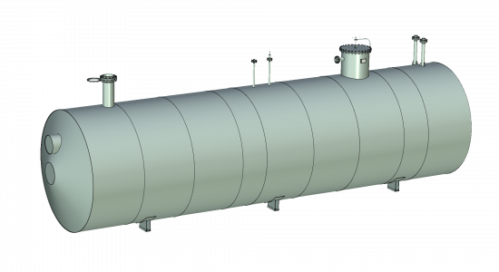 Емкости подземные конструктивно представляют собой полый цельносварной сосуд, работающий под давлением не выше 0,07 МПа, объемом до 200 м3, состоящий из металлического цилиндра и конических днищ. Для технологического обслуживания на верхней стороне обечайки, как правило, устанавливают два люка: один для слива хранимого продукта с помощью насоса, второй – для получения доступа внутрь для профилактического осмотра, технологического обслуживания и ремонта (очистка, продувка, промывка).